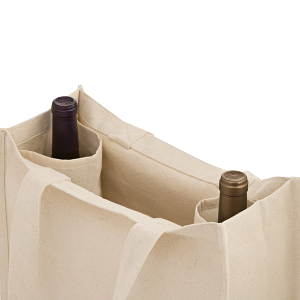 wine-n-gear’s 2-Bottle wholesale Heavy Cotton Canvas Grocery Wine Tote Bag features sewn-in dividers and convenient outside pockets. Heavy-duty 14 oz. cotton canvas. 22″ Handle. Large logo imprint space. This cotton tote is designed for reuse, allowing for 100’s if not 1000’s of brand impressions over the product lifetime. Perfect for runs to the grocery store, this bag features two bottle slots as well as a large middle grocery compartment.